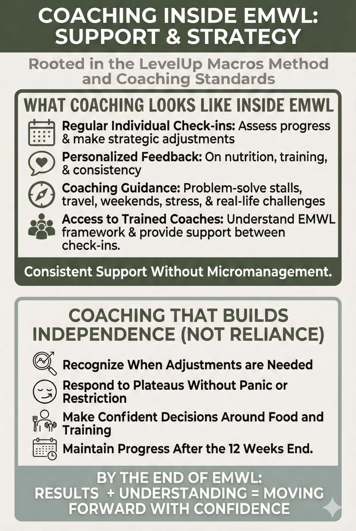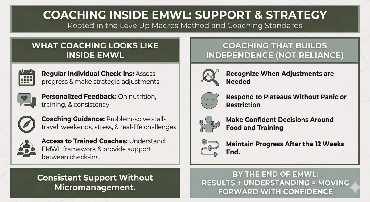 Throughout the 12 weeks, you’ll receive real coaching and guidance to help you apply the EMWL framework to your body, goals, and lifestyle, not a generic plan you’re expected to figure out on your own.
